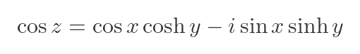We will now take a more detailed look at the cosine function. We won’t repeat this for the sine function, as the behaviour is quite similar. We have an expression for cos z, but it will be useful to express that in terms of the real and imaginary parts of z, which we will call x and y: