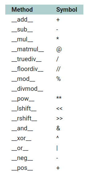 __truediv__corresponds to the/operator, which usually results in a floating point value.__floordiv__corresponds to the//operator which usually results in an integer value. If you want your class to support both types of division, you must implement both methods. For ourMatrixclass, we might decide that only true division is required.__matmul__, the@operator, is a special operator that is not implemented by any of the Python built-in types. It is called__matmul__because it is used by NumPy to implement matrix multiplication. But it can be used for anything, so if you have a class that has a special operation that doesn’t match any of the other magic methods, you can use__matmul__.__divmod__is a magic method that doesn’t correspond to any existing Python symbol. The built-in functiondivmod(a, b)returns two values, the floor dividea//band the modulusa%b. If you implement this method, your class will work correctly when it is passed into thedivmodfunction.__neg__is a unary-operator, as discussed earlier.__pos__is a unary+operator. It is included as the equivalent of__neg__for the+operator. In most cases, it has no effect, for example, +3 is exactly the same as 3. If you write your own classes, it is possible to give+a special meaning, so that+xwill affect the value ofx, although this could cause confusion because the operator usually has no effect.