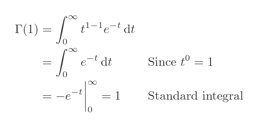 Statement (2) can be proved quite easily. For brevity, we will assume some standard results. We simply substitute x = 1 into gamma function definition from earlier: