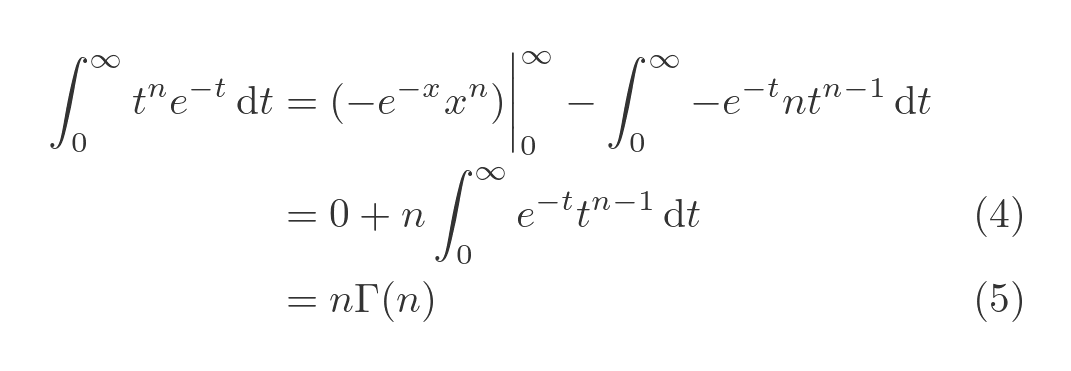 We also tidy up the integral term. In (5), we notice that the integral term is equal to nΓ(n), so Γ(n + 1) = nΓ(n), which completes our proof.