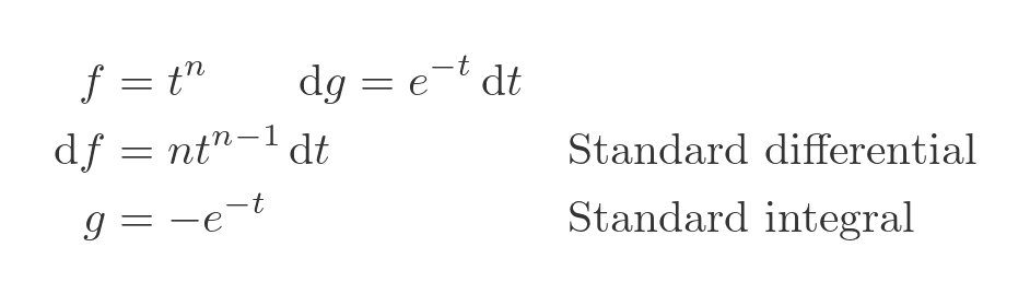 In equation (4), we notice that the first term (fg in the integration by parts formula) goes to zero. That is because, when x is zero, the exponential term is 1 and the x^n term is zero, so the whole thing is zero. When x goes to infinity, the term is also zero. That is because the exponential term goes to zero. The *x^n^ term goes to infinity, but the exponential term falls faster than the power term rises, so overall it goes to zero. We won't prove that here, but it can be shown fairly easily using L'Hôpital's rule.